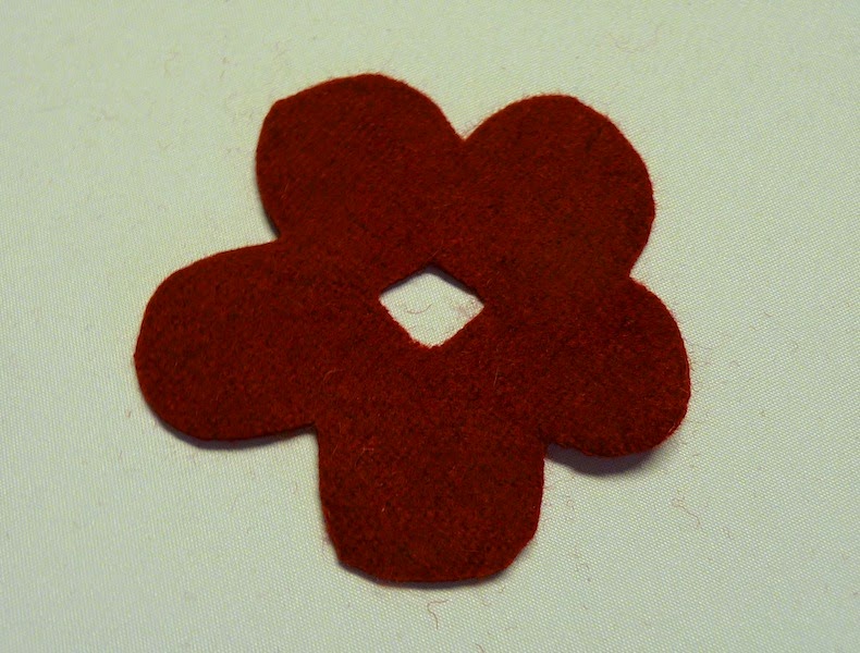 - Cut out the flower pattern and trace around it on your fabric. You will need six for each flower. Cut out the shape, fold in quarters and clip a hole in the center.